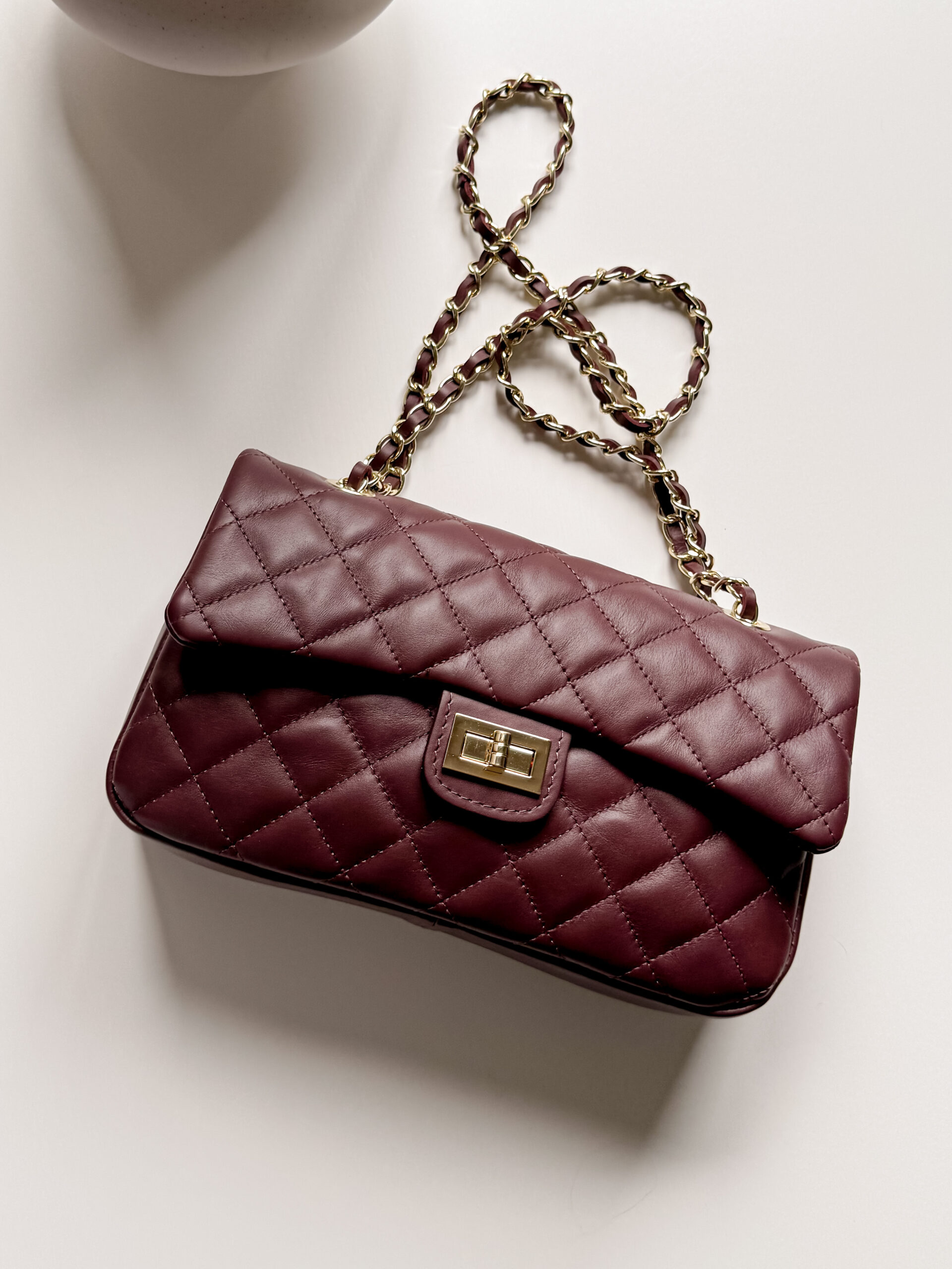 Torebka ma piękny kolor cherry. Ma łańcuszek i zapięcie koloru złotego. Łańcuszek można nosić na ramie i przez ramię na dwa sposoby jest przeciągany. Materiał to skóra naturalna  bydlęca. Wyprodukowana we Włoszech.