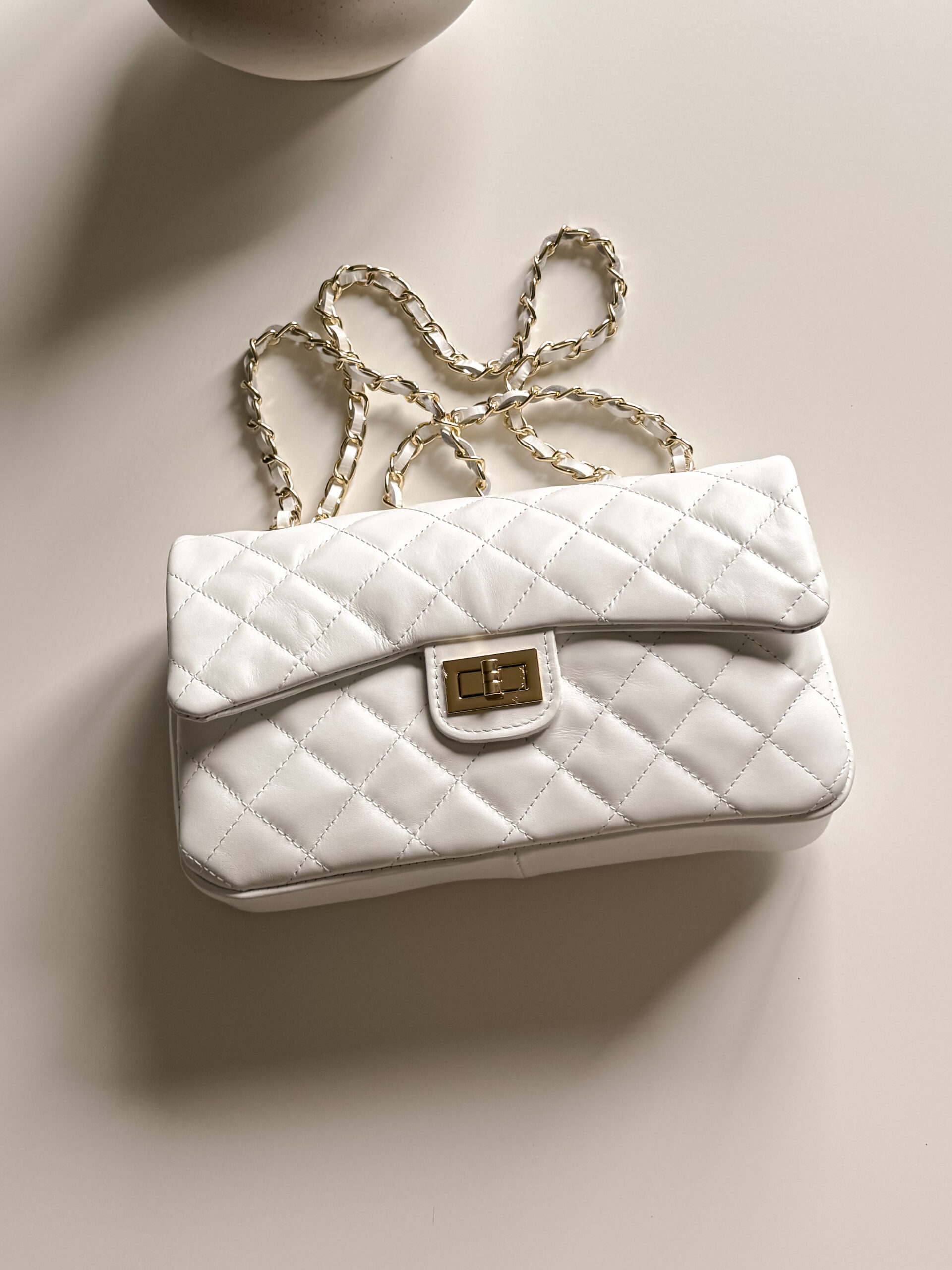 Torebka ma piękny kolor white. Ma łańcuszek i zapięcie koloru złotego. Łańcuszek można nosić na ramie i przez ramię na dwa sposoby jest przeciągany. Materiał to skóra naturalna bydlęca. Wyprodukowana we Włoszech.